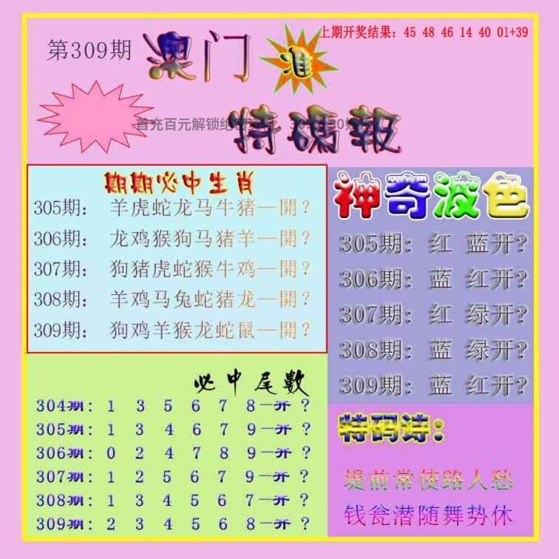 304期:七肖(猪狗马羊鼠兔猴)开:马48准 |